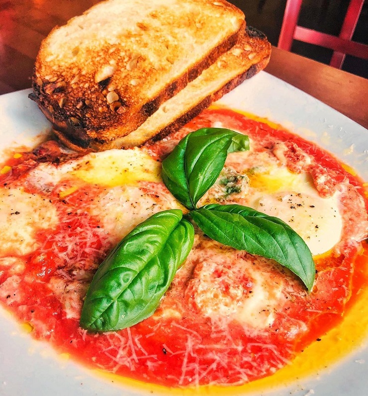 Over Medium in Tomato Sauce, Basil & Mozzarella. Choose Sweet or Spicy
